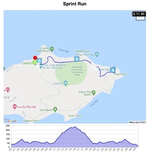 The sprint race features an 800m swim in the clear warm waters of St Croix, an 14 mile out-and-back bike along St Croix’s South Shore, and a 3.1 mile out and back run around the monument at the top of Point Udall, the eastern-most point of the United States before finishing back at Cramer Park.